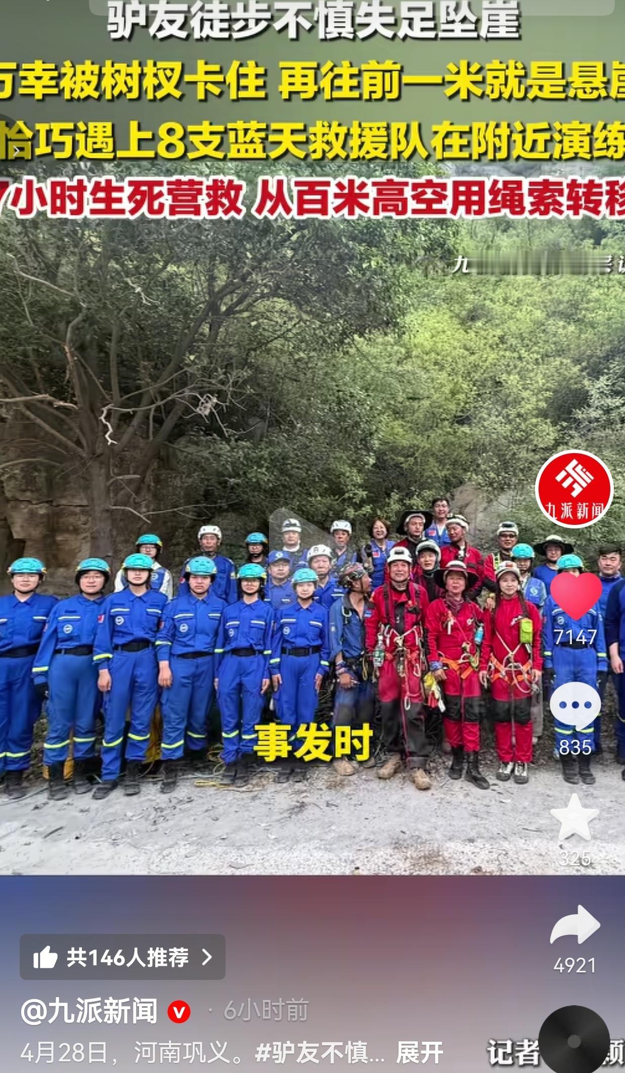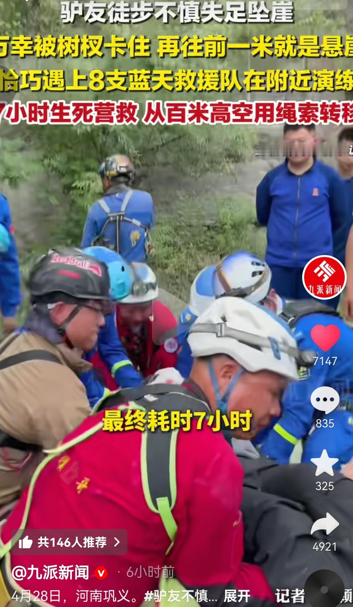 河南巩义这波“教科书级救援”,看得人又怕又燃! 4月26日河南巩义,一名驴友徒步失足坠崖,卡在了崖壁的树杈上,命悬一线,偏偏遇上8支蓝天救援队在附近演练,上演了一场7小时的生死营救。 据了解,这名驴友一脚踩空,整个人顺着近200米高的悬崖往下滑,万幸的是,下滑20多米后,被一棵歪脖子树的树杈死死卡住了。可往前再走一米,就是七八十米深的悬空崖壁,脚下连落脚的地方都没有。 更要命的是,他摔得浑身是伤:右脸大面积流血,眼睛肿得睁不开,手臂骨折、腰部受伤,连喊救命的力气都快没了。 就在他以为自己要困死在崖壁上的时候,远处传来了脚步声——巩义、郑州、登封等地的8支蓝天救援队,刚好在附近演练! 接到求助的那一刻,救援队的人几乎是立刻冲了过去。可这悬崖接近90度,根本没有下脚的地方,沿途全是灌木丛和松动的落石,队员们得先拿砍刀开路,再顶着碎石滑落的风险,顺着绳索往崖壁上挪。 每一步都踩在风化的碎石上,每一次伸手都得提防头顶的落石,他们就这么悬在百米高空上,硬生生挪到被困者身边,用专业的固定担架把他牢牢绑住,再一点一点往崖顶拉。 从下午到天黑,整整7个小时,他们在近200米高的悬崖上,顶着风、踩着险,硬生生把人从鬼门关拽了回来,最后顺利将伤者转移至安全地带,送上了救护车。 网友看到后评论说:我的天,这简直是现实版的“天降神兵”!前脚刚遇险,后脚就遇上救援队演练,这运气,说句命大不过分吧? 也有的网友说:看着那90度的悬崖我腿都软了,救援队的人也太拼了!就靠一根绳子吊在半空,还得防着落石和灌木丛,换我早就吓哭了,真的太佩服他们了。 还有的网友说:真的提醒一句,非专业路线别乱闯!你遇险,救援队就要冒着生命危险来救,这不是小事,是对自己和别人都不负责任! 说真的,看完整个视频,我心里是既后怕又特别震撼。 后怕的是,这哥们差一点就掉下去了,卡在树杈上的每一秒,都是和死神在掰手腕。 震撼的是,这些蓝天救援队的队员,他们不是什么超级英雄,只是一群拿着绳索、顶着落石往前冲的普通人。他们演练的目的,就是为了在这种时候,能多抢回一条命。 可转念一想,这种“幸运”,真的值得羡慕吗?如果那天没有救援队在附近,这哥们的结局会是什么?那些所谓的“野路”“无人秘境”,真的比命还重要吗? 我见过太多驴友闯野路遇险的新闻,每一次,都是救援队冒着生命危险去兜底。他们的每一次出发,都不是理所当然的,是他们在用自己的专业和勇气,为每一次疏忽的后果兜底。 你可以喜欢徒步,喜欢山野,但请永远记住:没有哪一次冒险,值得用生命去赌;也没有哪一次救援,是别人欠你的。 那些悬崖边的树杈救不了你,能救你的,只有敬畏规则的自己,和拼尽全力的他们。 所以说,别拿运气当资本,别拿生命当玩笑。你以为的“说走就走”,背后可能就是别人拿命在为你托底。 对此,你怎么看? 信息来源:九派新闻