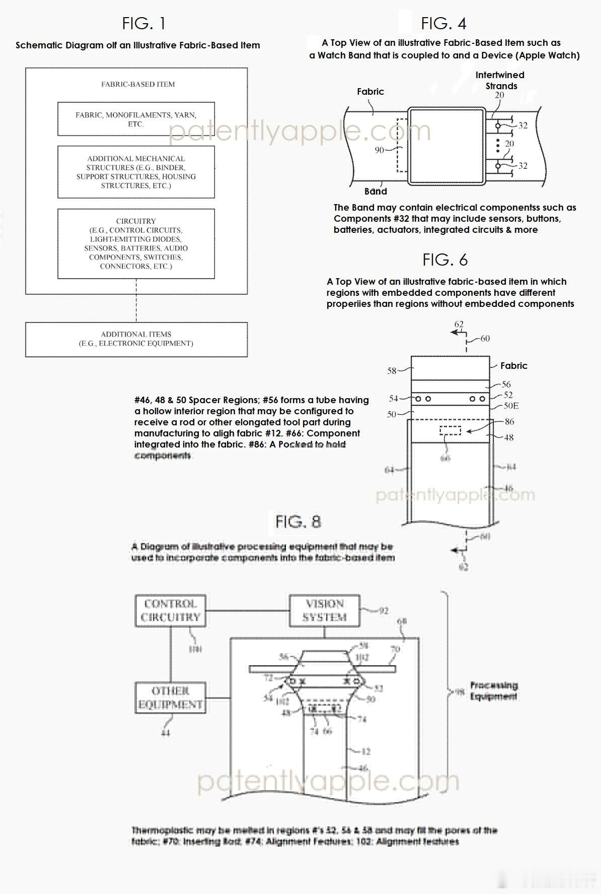 这项技术的核心思路,是让织物同时充当外壳结构与电路互联载体。内置部件既可以是机械结构(例如用于和Apple Watch表体卡扣衔接的固定组件),也可以是电子装置(如各类传感器、焊接在织物导电纱线上的集成电路)。