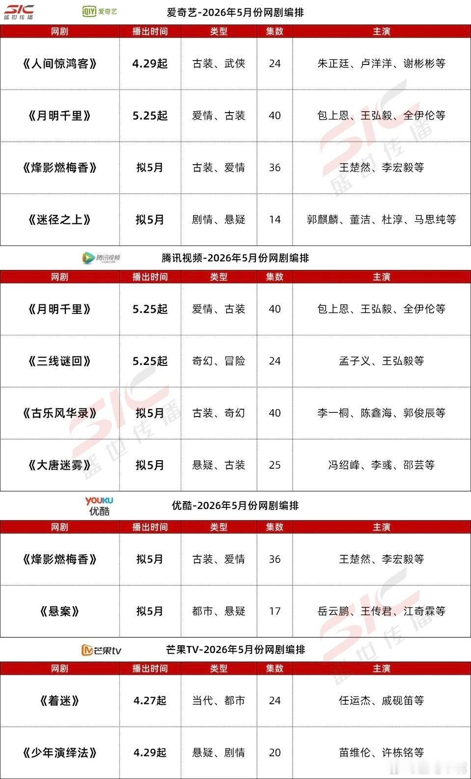 四大平台五月排播:爱奇艺:《烽影燃梅香》《月明千里》《迷径之上》《低智商犯罪》《喀什恋歌》