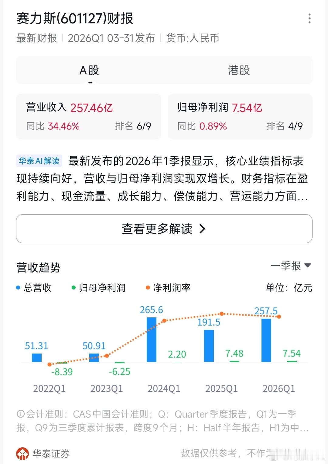 昨天赛力斯发布了今年一季度的财报,营收257.5亿同比涨34.5%,净利润7.5亿,新能源销量7.85万辆同比涨43.9%,同时研发砸17.9亿同比涨70.7%。这点其实主要是问界和华为深度绑定,智能驾驶、鸿蒙座舱这些技术确实可以,毕竟是华为的强项,在新能源智能车赛道里,消费者就认这个;其次就是新技术新车型迭代快,能抓住机会,问界早都开始吃传统合资豪华品牌的份额了,这就是个跑步进场的时代,赛力斯能很快把技术投入转化成了产品竞争力,再靠产品竞争力撑起了品牌和销量利润,本身就是一种实力。鸿蒙智行大v聊车新能源汽车赛力斯国产车