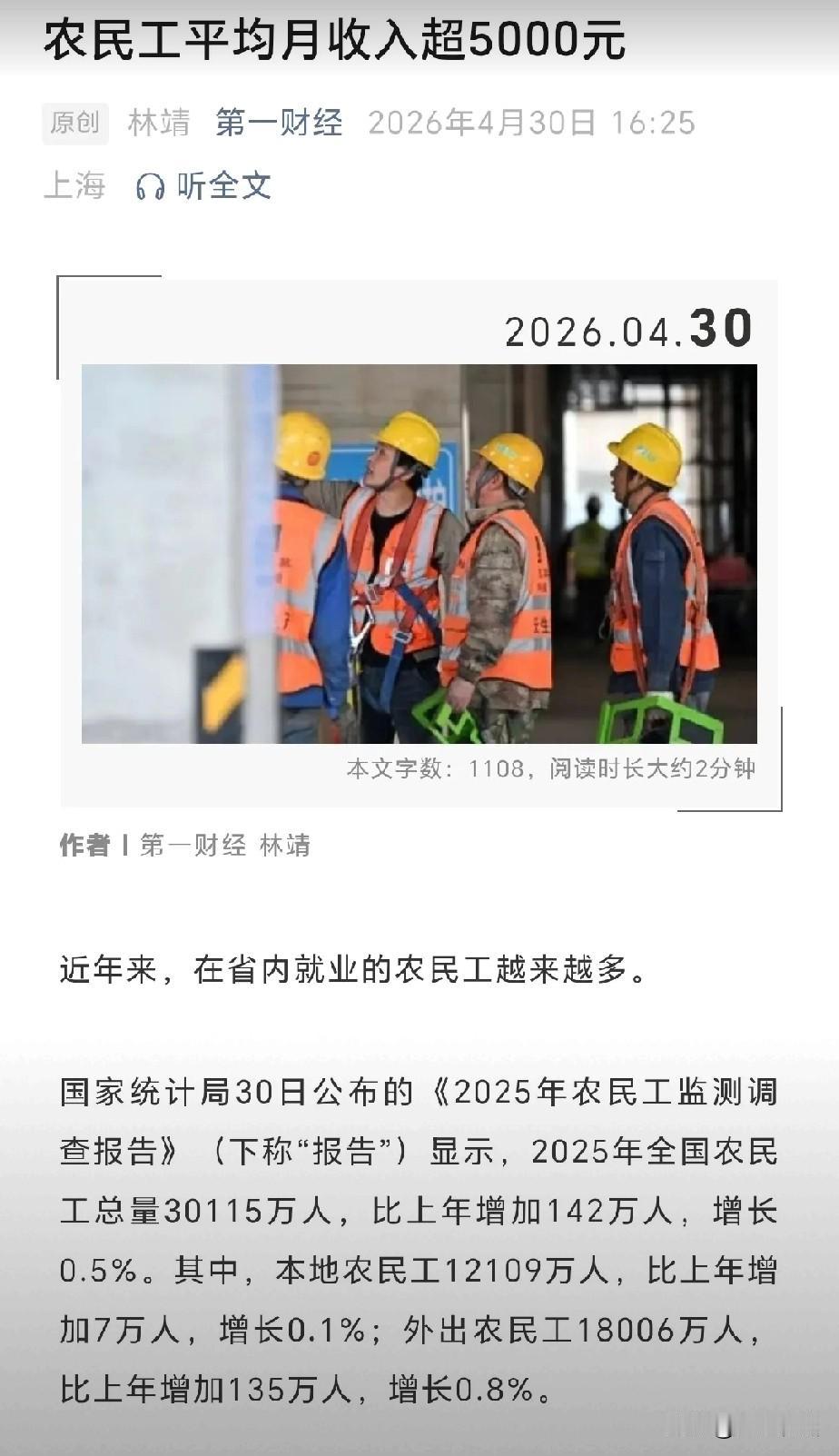第一财经的记者调查还是很客观的,农民工平均月收入超过5000元!过去的打工大军慢慢消失不见了,农民工省内就业的人越来越多,跨省的越来越少。 国家统计局数据,2025年农民工就业人数是增加的,不知道是不是一层一级统计上去的,农民工就业的最大群体是建筑工人,这几年从业人数锐减。而工业企业农民工使用量因为自动化和机器人的代替,也会越来越少。这个数据有点值得斟酌。 农民工月收入超过5000,我认为有些人会超过一万,但这并不影响他们做一天没一天的,更不影响他们没有五险一金[祈祷]打工人就业现状 城市打工人收入