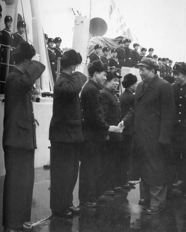 1953年2月24日,毛泽东主席在南京下关码头视察人民海军“南昌号”护卫舰,这是新中国海军初创时期,最高领导人登舰视察的标志性影像。 毛主席身着深色长大衣、头戴便帽,正在甲板上与海军官兵亲切握手,身旁的军官们庄重敬礼,整齐列队的舰上水兵,展现了当时人民海军迎接最高领导人的礼仪。 1953年2月,毛泽东主席首次视察人民海军舰艇部队,从武汉顺江东下,先后视察了“长江”舰、“洛阳”舰、“南昌”舰等多艘舰艇。在“南昌号”上,毛主席为人民海军写下了著名题词:“为了反对帝国主义的侵略,我们一定要建立强大的海军”。