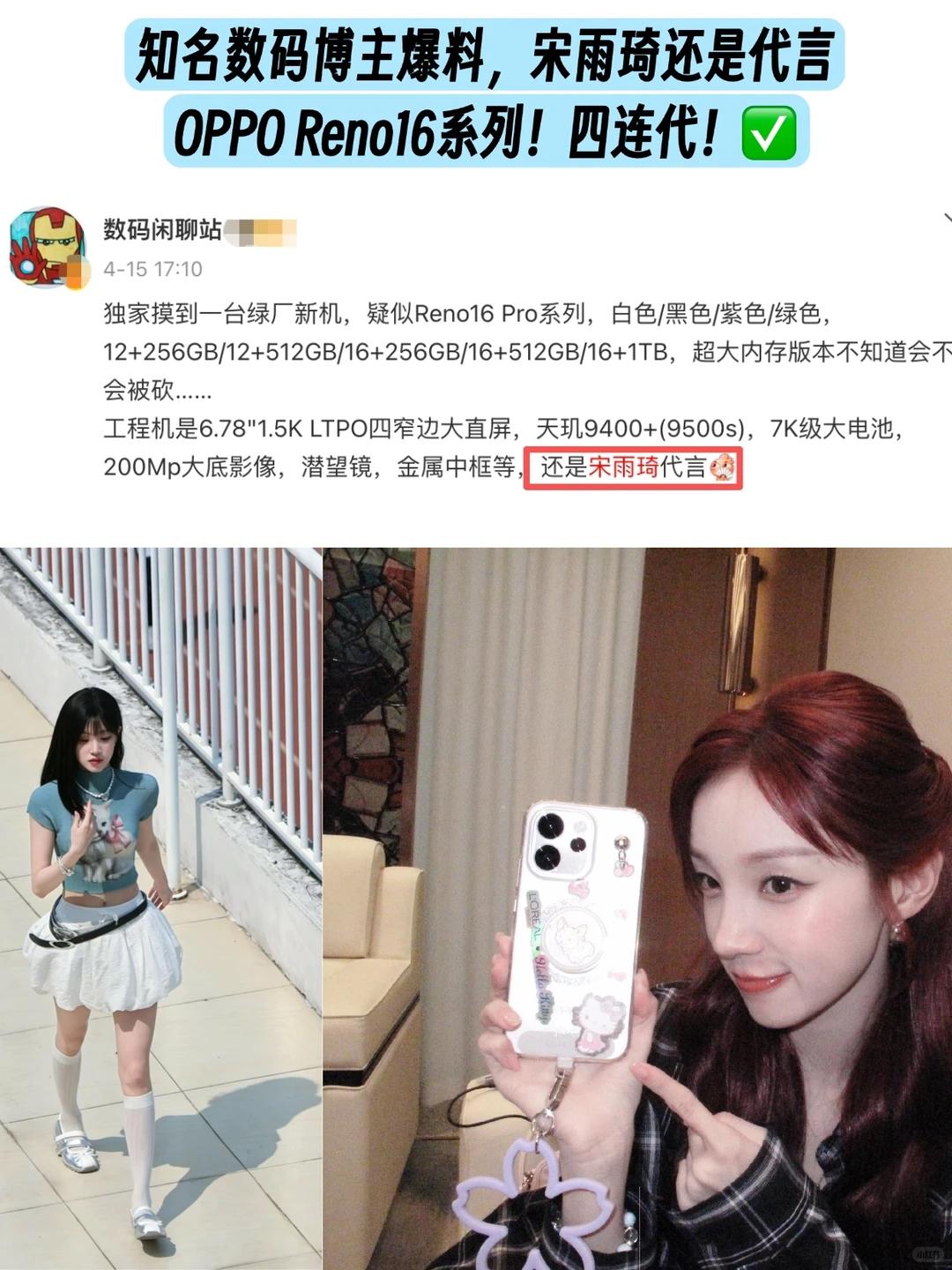 OPPO Reno16官方公布!宋雨琦四连代言?! 吗耶,刚刚刷手机看到OPPO官方开始了Reno16系列预约,有标准版和Pro,之前宋雨琦有个路透很可能是在拍这个物料!有数码博主也爆料了,应该跑不了,宋雨琦四连代,这个含金量有点高,之前Reno15系列卖得很火,期待16! 宋雨琦 OPPOReno16 宋雨琦OPPO 明星代言 宋雨琦代言OPPO