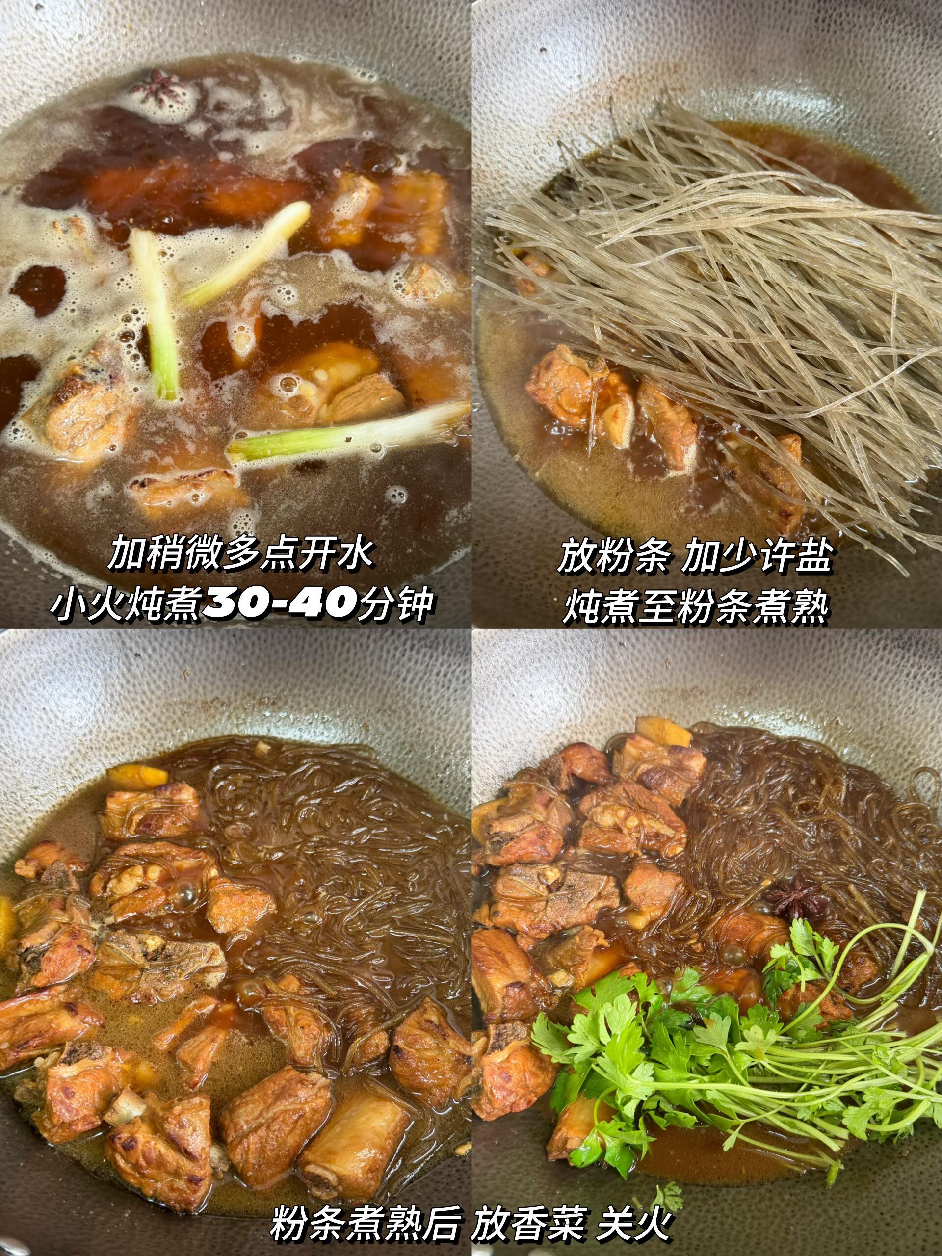 香辣入味!红烧排骨炖粉条,一口就上头✨ 家人们,这款红烧排骨炖粉条真的太绝了,软嫩入味还不油腻,每一口都越吃越香,妥妥的下饭神器,不管是日常家常还是家人小聚,都是闭眼冲的选择😋 食材准备 排骨、红薯粉条、葱、姜、八角、冰糖、生抽、蚝油、料酒、盐、香菜 详细做法(无多余添加,贴合原步骤) 排骨冷水下锅,加入葱、姜和适量料酒,焯水后捞出,用清水冲洗干净,沥干备用; 起锅烧油,小火放入冰糖,慢慢翻炒至冰糖融化、呈现枣红色且冒大泡时,放入焯好水的排骨,快速翻炒至每块排骨都均匀裹上糖色; 加入葱、姜、八角,翻炒出香味后,依次加入两勺生抽、一勺蚝油、一勺料酒和少许老抽,翻炒均匀,让每块排骨都充分吸收调料香味; 倒入足量开水,小火慢炖 30-40 分钟,至排骨软烂入味,再放入粉条,加少许盐,继续炖煮至粉条变软吸满汤汁,最后撒上香菜即可。