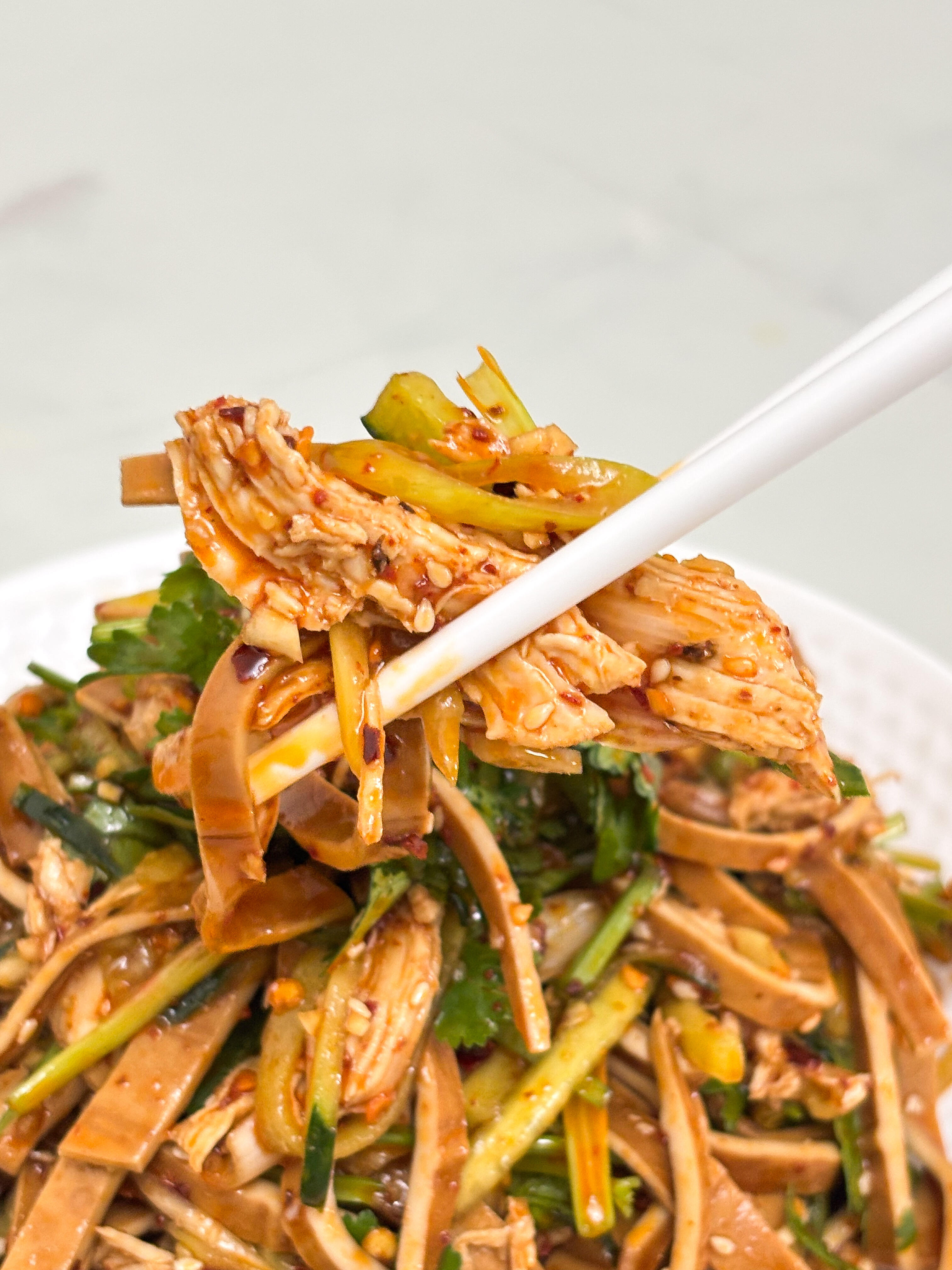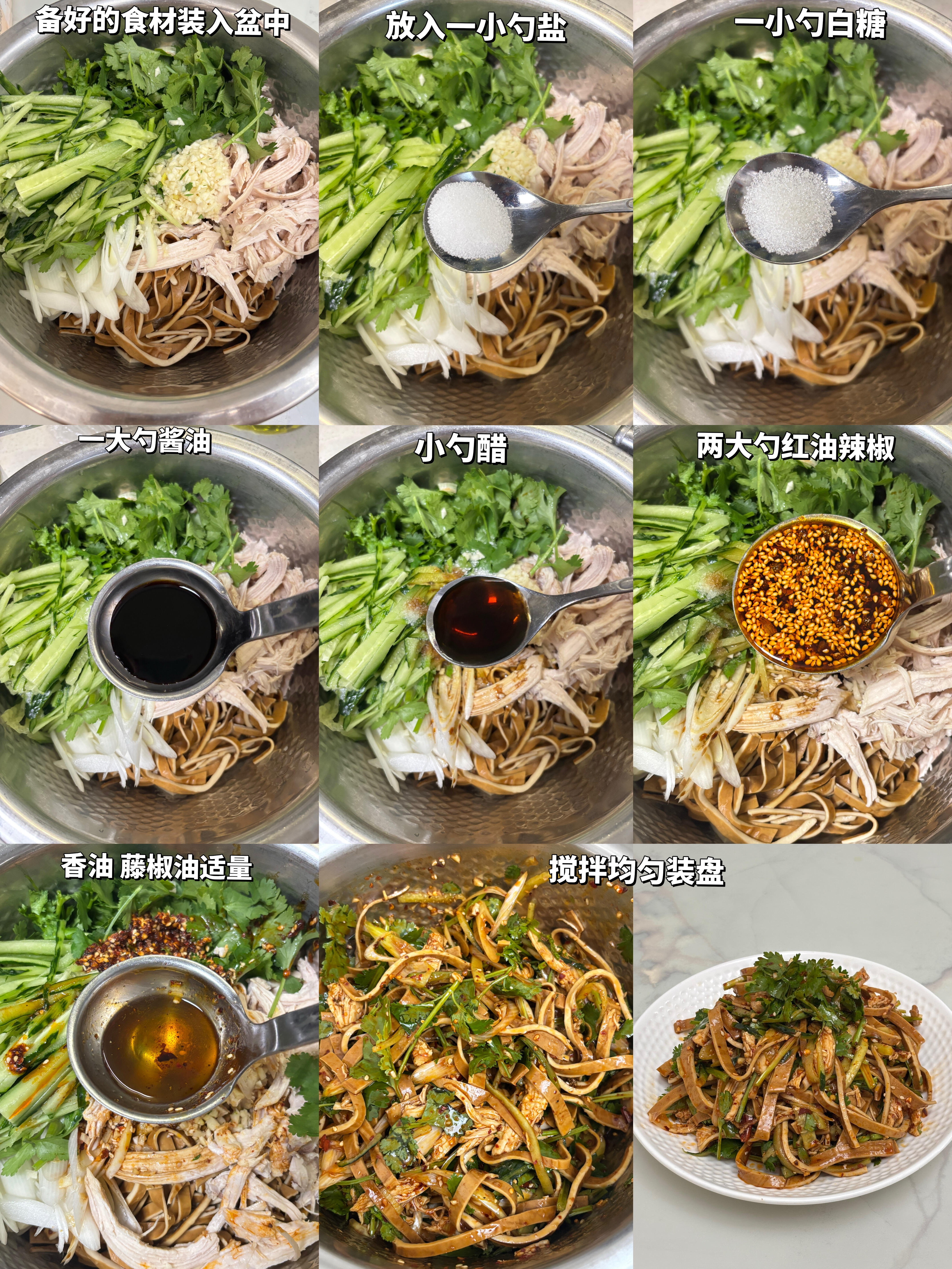 巨下饭凉拌菜✨鸡丝拌豆干,鲜香不腻超入味 巨下饭的凉拌菜来啦——鸡丝拌豆干,好吃到停不下来😋 谁懂这个凉拌菜的含金量啊!每一口都鲜香入味,越吃越上头,根本停不下来。没有厚重的油腻感,清爽又解馋,不管是配米饭、拌面条,还是当小凉菜,都超合适。 豆干筋道、鸡丝软嫩、黄瓜脆爽,再加上大葱和香菜的提香,所有食材都裹满了浓郁料汁,入口鲜香不腻,口感层次拉满,厨房小白也能轻松拿捏,不用复杂技巧,几分钟就能搞定。 (做法在下方,简单好记,跟着做不翻车) 🍃 食材准备(家常易得,不用额外囤货): 牛皮豆干、鸡胸肉、黄瓜、大葱、香菜、蒜末 🍃 详细做法(零难度,小白也能会): 1. 鸡胸肉冷水下锅,煮15分钟左右,捞出后放凉,用手撕成均匀的鸡丝;牛皮豆干切条,放入沸水中焯水,捞出沥干备用;黄瓜、大葱分别切成细丝,香菜切成小段,准备足量蒜末,往蒜末中加少许清水搅拌均匀,口感更柔和。 2. 取一个大盆,将撕好的鸡丝、焯好水的豆干条、黄瓜丝、大葱丝、香菜段和调好的蒜末全部放进去,加入一小勺盐、一小勺糖,一大勺生抽、一小勺香醋,两大勺红油辣椒(这是这道菜的灵魂,不能少!),再加入一勺香油和一勺藤椒油,用筷子充分搅拌均匀,让每一种食材都裹满料汁,即可装盘食用。 鲜香不腻,清爽入味,筋道的豆干搭配软嫩的鸡丝,再裹上香辣过瘾的料汁,一口下去超满足。做法简单还省时,不用开火,夏天吃解腻又开胃,冬天吃也不厚重,日常解馋、餐桌配菜都超合适,赶紧动手试试~
