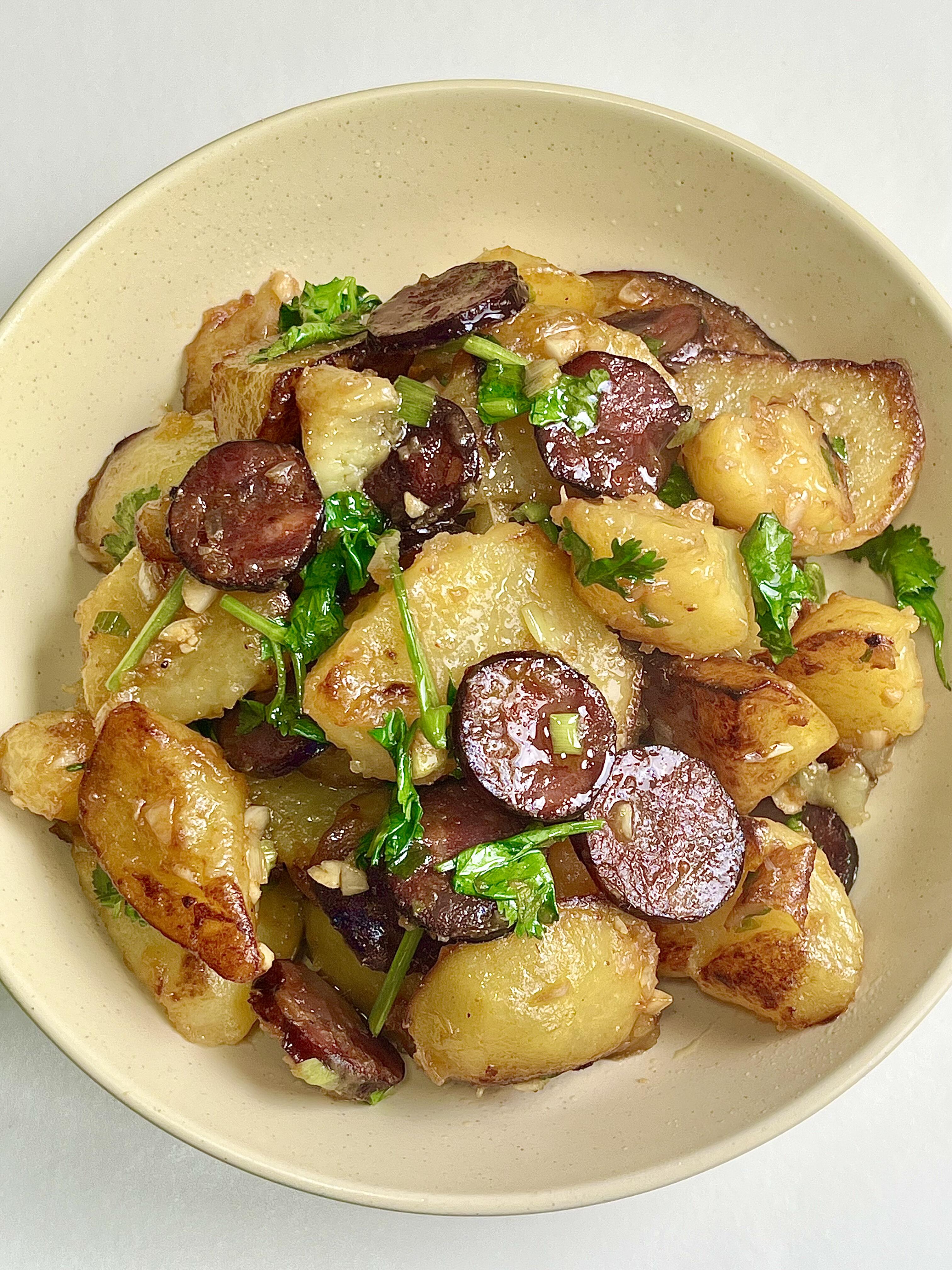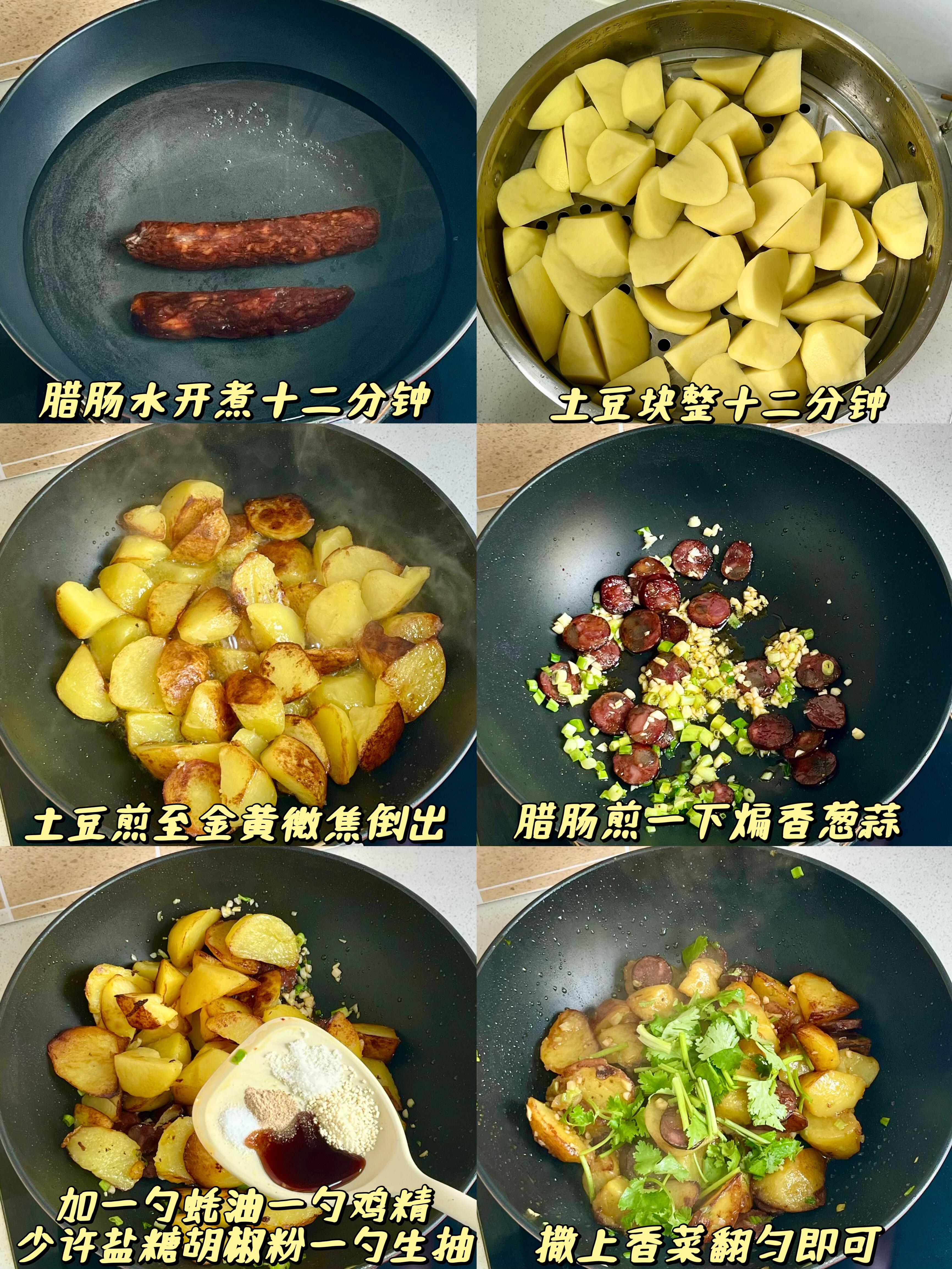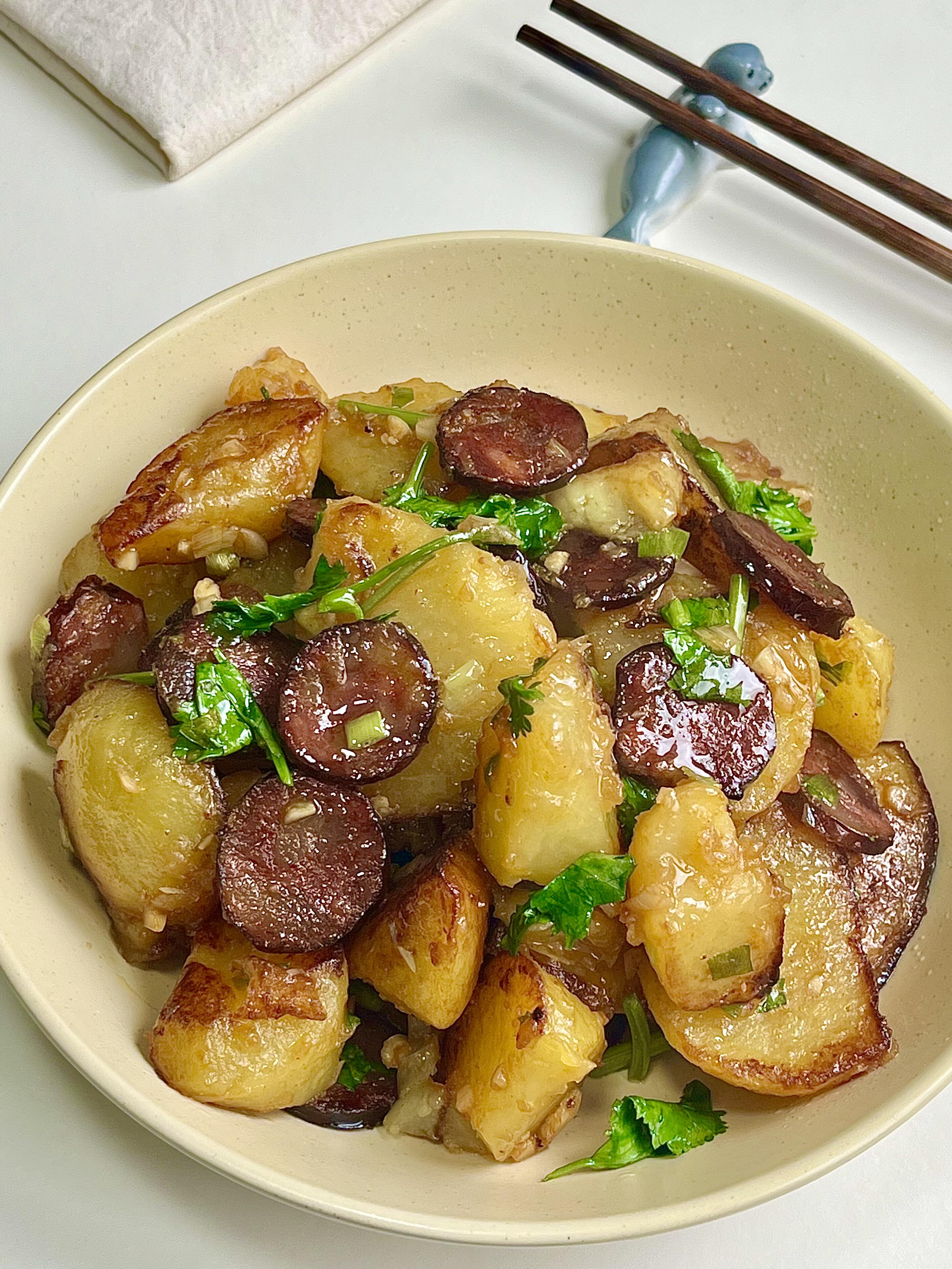 腊肠焖土豆🥔 咸香入味,家常下饭菜yyds 家常饭菜的魅力,从来都不在复杂,就像这道腊肠焖土豆,简单一做就香到上头 最抚凡人心的,莫过于一碗热气腾腾的家常味,不用复杂调味,朴实又治愈 焦香的腊肠,搭配软糯绵密的土豆,翻炒的时候,腊肠的油脂香气全被土豆吸得干干净净 咸香浓郁,滋味一层叠一层,入口鲜香不腻,没有多余的调味,却越吃越有味道 妥妥的下饭神器,就着这道菜,我能轻松吃光一碗满满当当的米饭,全家都爱吃 —————————— 👨🍳【家常详细步骤】👨🍳 1)土豆去皮切成小块,用清水冲洗干净,洗去表面多余淀粉;准备两根腊肠,再切好葱花、蒜末和香菜段备用。 2)锅中加水烧开,放入腊肠煮12分钟,煮好后捞出过一遍凉水,切成薄片;另起锅,将土豆块蒸12分钟,取出后放入锅中,煎至表面金黄微焦,盛出备用。 3)锅中留少许底油,放入切好的腊肠薄片,略微煎一下,煸出油脂后,放入葱花和蒜末爆香。 4)倒入煎好的土豆块,加1勺蚝油、1勺鸡精、少许盐、少许糖、少许胡椒粉和1勺生抽,快速翻炒均匀,最后撒上香菜段,翻炒两下即可装盘。 小贴士:腊肠本身有咸味,盐要少放;土豆煎至微焦更香浓,蒸过再煎不易碎,口感更软糯~