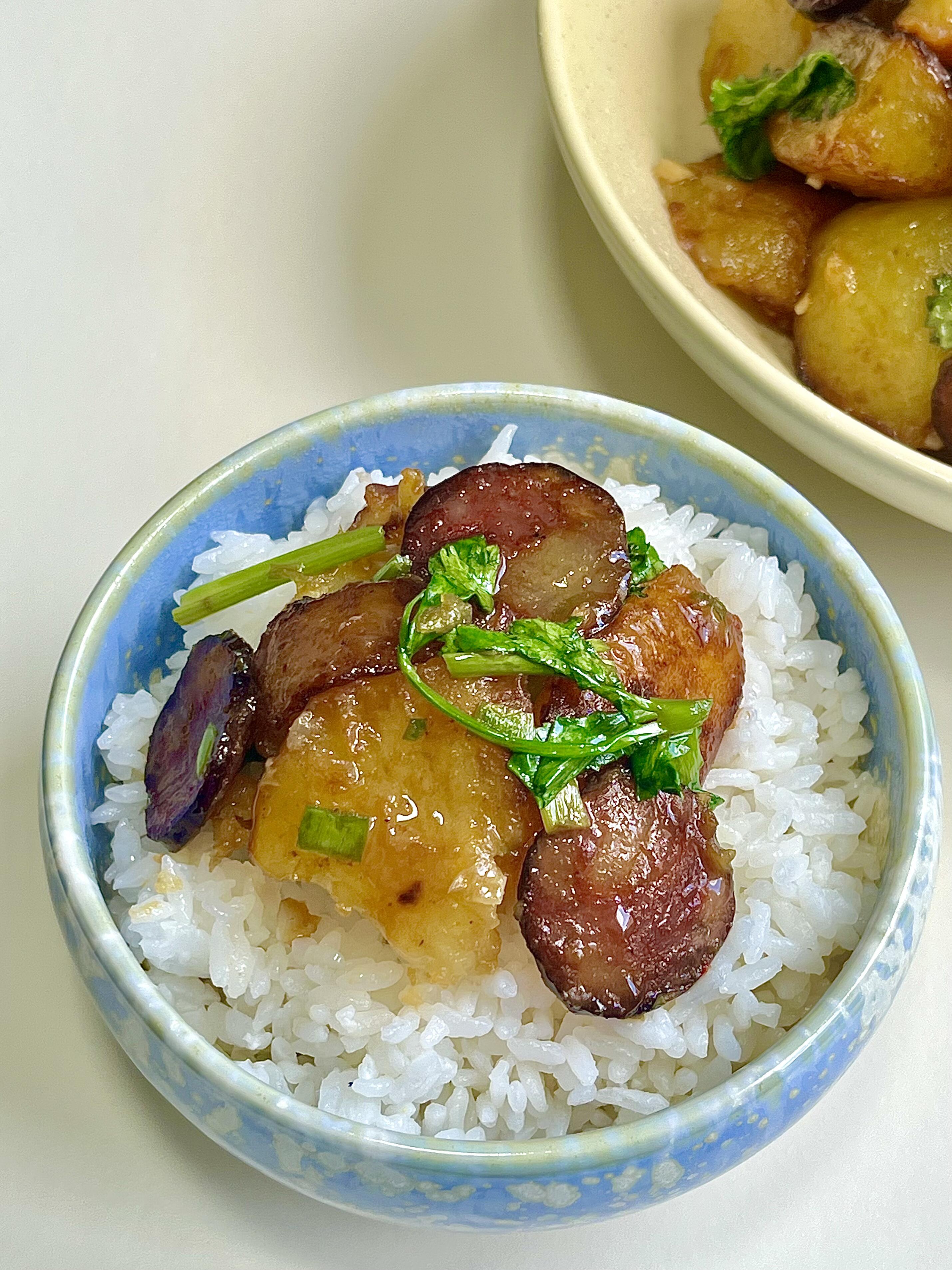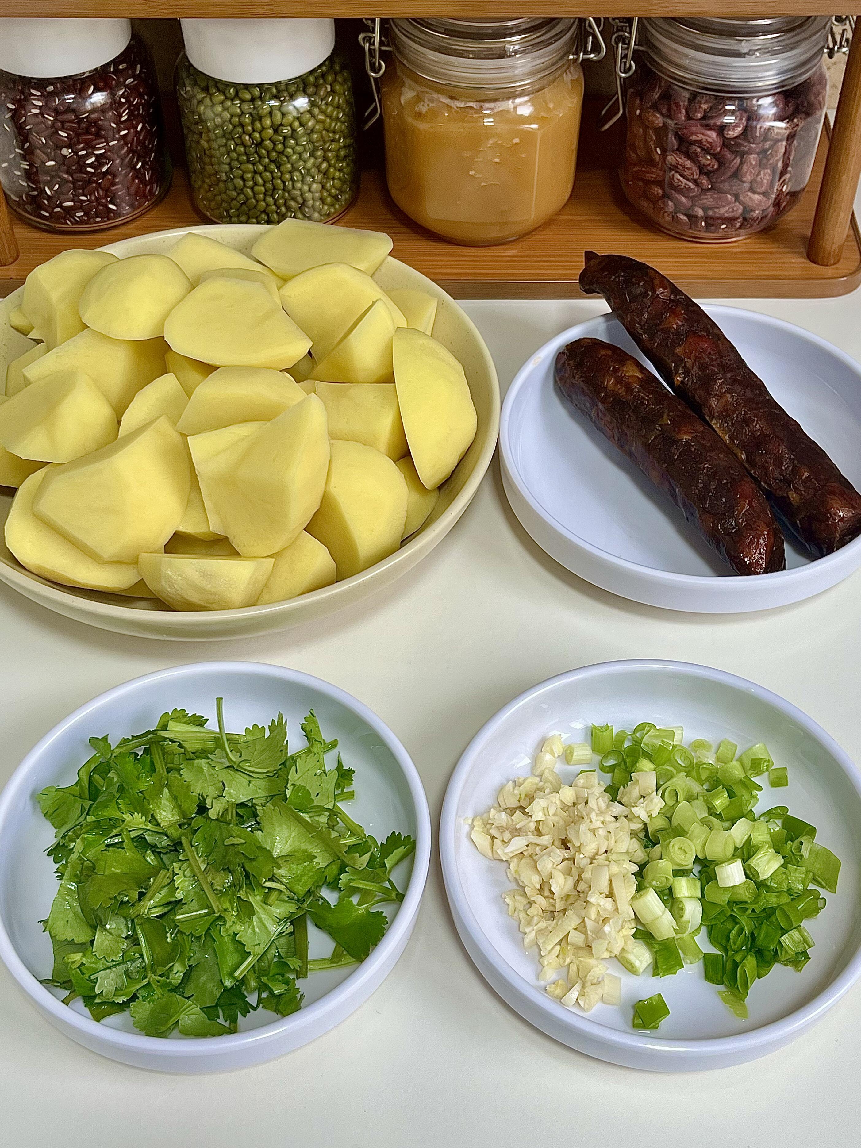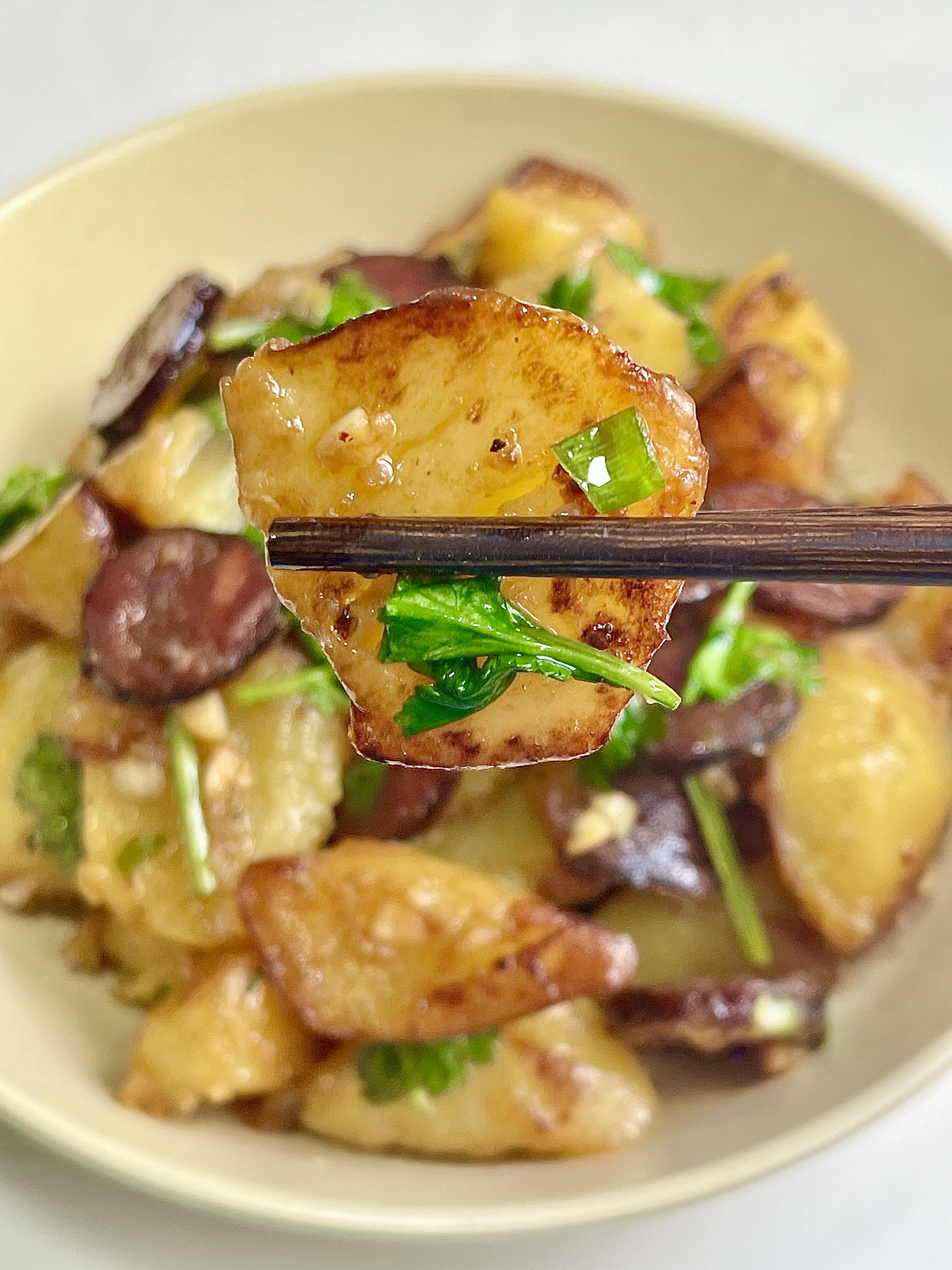腊肠焖土豆🥔 咸香入味,家常下饭菜yyds 家常饭菜的魅力,从来都不在复杂,就像这道腊肠焖土豆,简单一做就香到上头 最抚凡人心的,莫过于一碗热气腾腾的家常味,不用复杂调味,朴实又治愈 焦香的腊肠,搭配软糯绵密的土豆,翻炒的时候,腊肠的油脂香气全被土豆吸得干干净净 咸香浓郁,滋味一层叠一层,入口鲜香不腻,没有多余的调味,却越吃越有味道 妥妥的下饭神器,就着这道菜,我能轻松吃光一碗满满当当的米饭,全家都爱吃 —————————— 👨🍳【家常详细步骤】👨🍳 1)土豆去皮切成小块,用清水冲洗干净,洗去表面多余淀粉;准备两根腊肠,再切好葱花、蒜末和香菜段备用。 2)锅中加水烧开,放入腊肠煮12分钟,煮好后捞出过一遍凉水,切成薄片;另起锅,将土豆块蒸12分钟,取出后放入锅中,煎至表面金黄微焦,盛出备用。 3)锅中留少许底油,放入切好的腊肠薄片,略微煎一下,煸出油脂后,放入葱花和蒜末爆香。 4)倒入煎好的土豆块,加1勺蚝油、1勺鸡精、少许盐、少许糖、少许胡椒粉和1勺生抽,快速翻炒均匀,最后撒上香菜段,翻炒两下即可装盘。 小贴士:腊肠本身有咸味,盐要少放;土豆煎至微焦更香浓,蒸过再煎不易碎,口感更软糯~