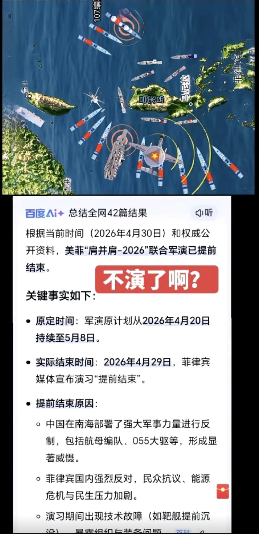美菲肩并肩演习演不下去了,据说是他们的靶舰忽然没有了,而旁边围着看猴戏的10多艘军舰据说发射了一枚反舰导弹,这演习演得挺累,旁边有个观众吃瓜不说,偶尔还喊打喊杀,现在老美出门都要看黄历,搞不好就要挨揍,心里虚的一逼,只有他们海军舰员自己心里明白,弄一个胡赛武装都掉几架飞机,再到伊朗的阴影,现在靶舰居然没有了,自己这肩并肩又不是主力,旁边的观众又强得可怕。