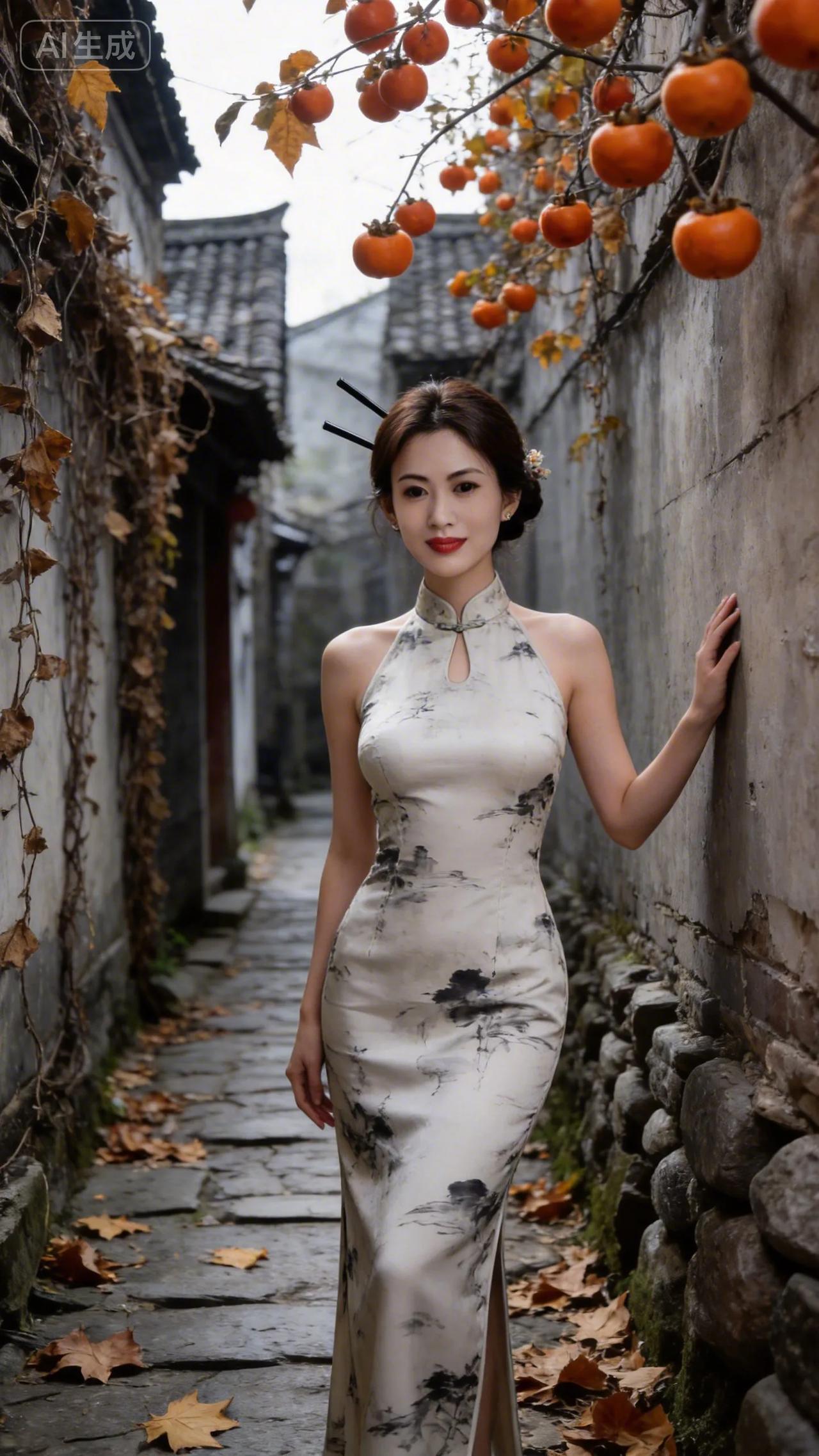 黛瓦白墙的深巷里,水墨旗袍裹着东方韵致。枝头红灯笼似的柿子缀满秋光,与鬓边簪花相
